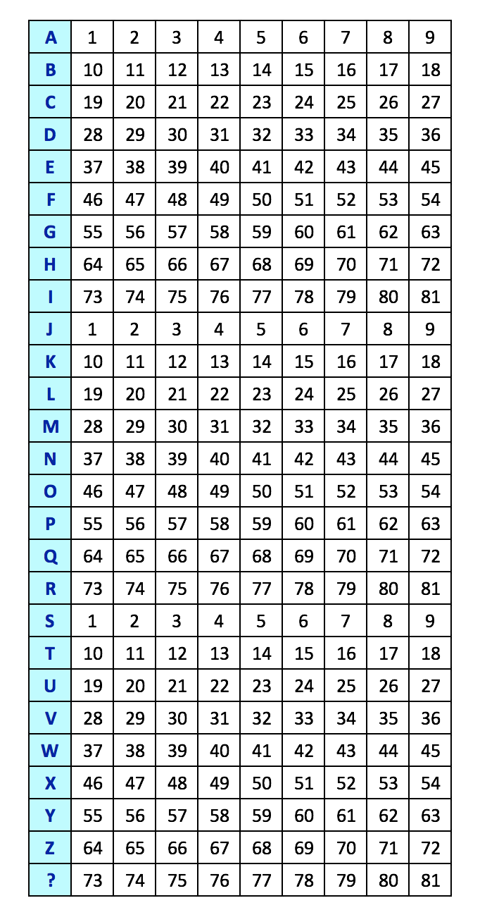 135 est la valeur de la lettre O de la table de 9.